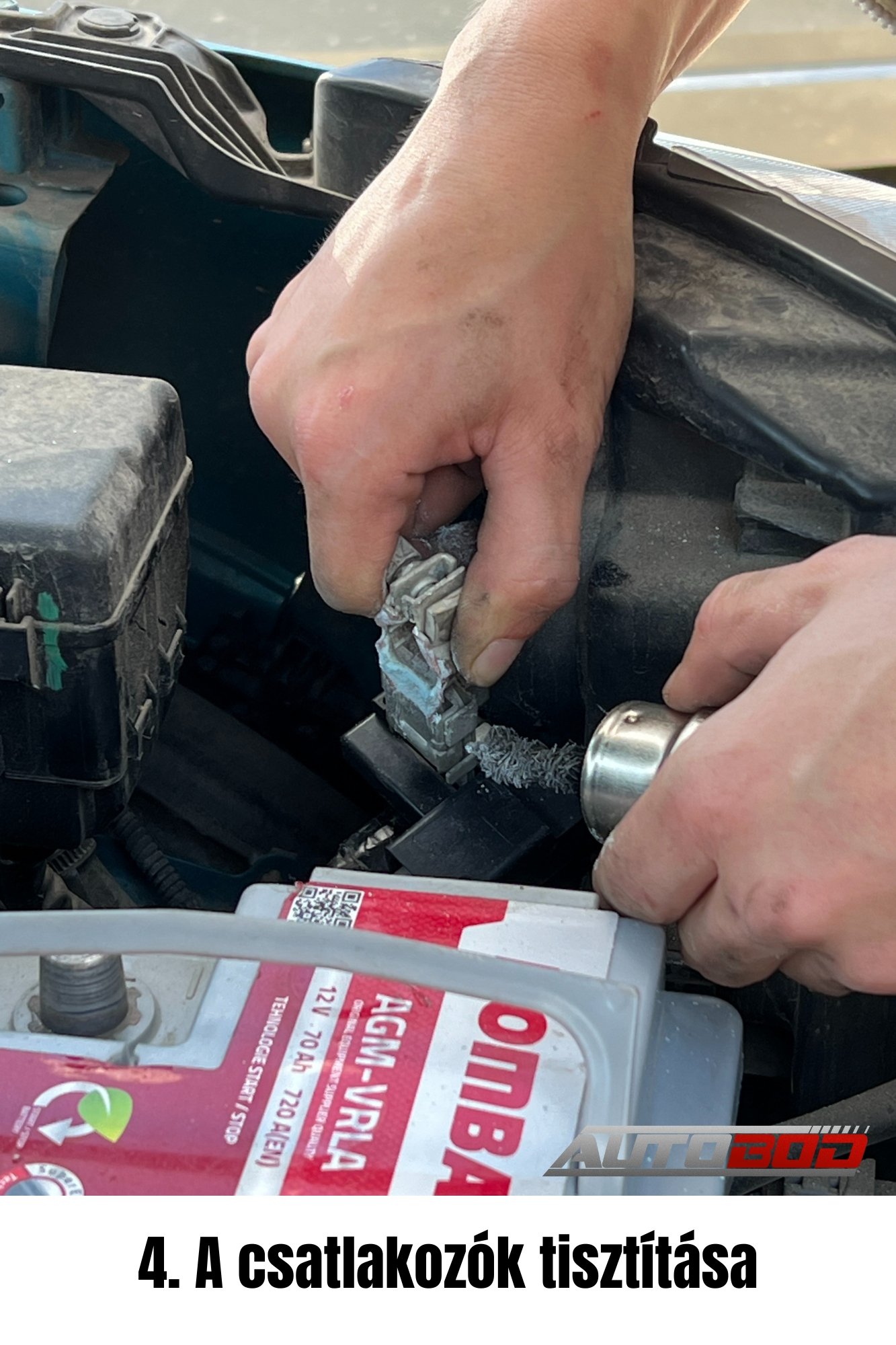 4. Negyedik lépés: A saruk alapos tisztítása – Az optimális érintkezésért A régi akkumulátor kivétele után alaposan megtisztítjuk a kábelek saruit. Gyakran előfordul, hogy az akkumulátor pólusain és a sarukon oxidáció vagy korrózió alakul ki, ami jelentősen rontja az elektromos vezetőképességet. Ennek eltávolítása létfontosságú az új akkumulátor hosszú élettartama és a stabil áramellátás érdekében.